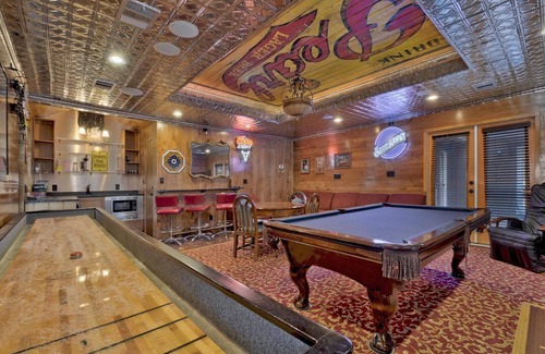 Check out the cool game room with just about everything you can think of including a pool table, shuffleboard, flat screen TV with surround sound and DVD player as well as a wet bar with ice maker to create your own private club. The game room is accented with wood walls, pressed tin ceilings, stained glass, neon signs and inlaid ceiling repurposed from an old wall from a turn of the century saloon. If you get hungry while watching a movie, heat up a pizza in the pizza oven or pop some popcorn in the microwave.