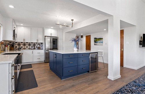 The second-floor chef’s kitchen includes all new appliances and a dining room table set up for 8-10 guests. Relax and catch up after a long day of shopping, hiking, or skiing in the spacious living room with an attached deck.