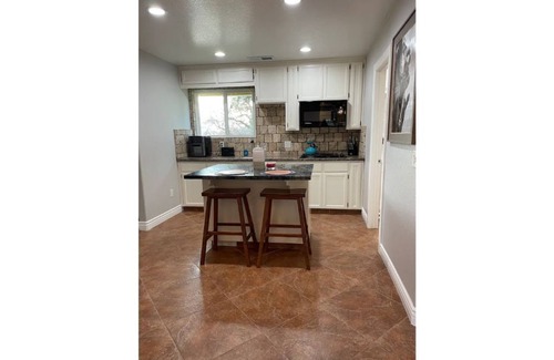 You will stay in our 2 bedroom guest house where you will have your own driveway. When you walk into the home, you walk into the living room with a couch and 65” TV. The kitchenette has a microwave, gas burner stove, small sink with garbage disposal, kitchen island, plenty of counter space, a coffee bar and a full size fridge. An air fryer is provided but there is no oven. One bathroom with a shower. One room has a California king bed. The second room has a set of bunk beds and a sofa bed. We also have a queen sofa bed in the living room, air mattresses and 2 cots. Home can sleep 6 very comfortably.