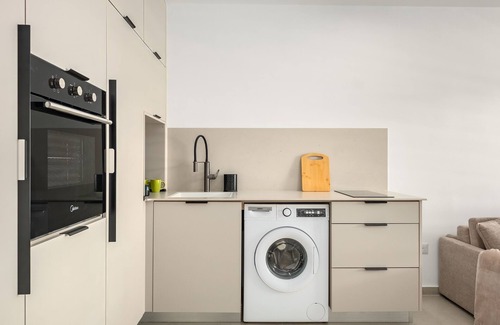 The open-plan living area includes a fully equipped kitchen with a microwave, oven, stove, kettle, Nespresso machine, and refrigerator. A washing machine and 50-inch Smart TV are also provided for added convenience and comfort.