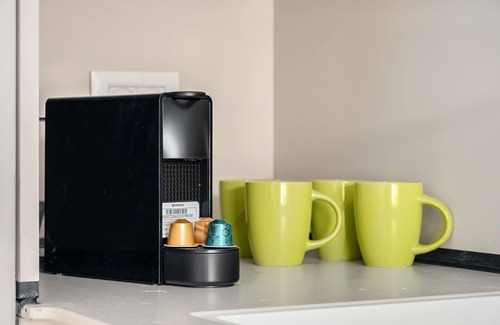 The open-plan living area includes a fully equipped kitchen with a microwave, oven, stove, kettle, Nespresso machine, and refrigerator. A washing machine and 55-inch Smart TV are also provided for added convenience and comfort.
