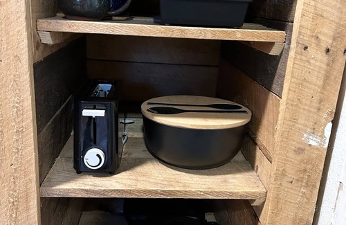 Accommodation: Stylish, rustic studio-cabin with a luxurious queen bed.