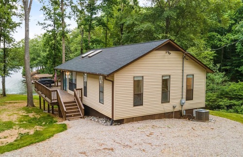 Our home has had a complete renovation. We gutted the entire thing from top to bottom. The main floor has 3 bedrooms. The master has a queen with an attached bathroom. Bedroom number 2 has a full size bed. Bedroom 3 has twin size bunk beds. Bathroom number 2 is located in the hall. The kitchen, dining and living room are all open with cathedral ceilings and gorgeous views of the lake. The living room has 5 sliding glass doors over looking the. The dining table seats 6 plus there are 3 bar-stools at the bar. Walk down the spiral staircase to a gorgeous view of the lake through the triple sliding glass doors. The den has a pull out couch, tv and poker table. Bedroom 4 with a queen bed is located beside the den and next to bathroom number three on the lower level. Outside of the home are two massive decks overlooking the lake, one on the main level and one below that walks out towards the lake. We have a 2 slip boat dock for and any toys you may bring for your stay. In the garage, we have a double kayak and a 2 person pedal boat for you to use.