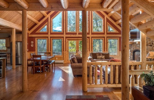 This Luxury Cedar Log Home offers views of the Sunday River slopes and is located directly on the Sunday River itself. You will enjoy a world class rustic 18th century style log home with 21st century comforts and amenities. Only 1 mile to the lifts at Sunday River Ski resort. This property was designed to accommodate everyone in your group. Comfortably sleep 16 (14 adults max) privately. You will enjoy central air, on demand hot water and WiFi throughout. The outside offers four levels for entertaining and sweeping views. The main deck includes custom gazebo with seating area, outdoor gas fire place, gas grill and dining area. Lower level houses the 6-8 person hot tub in the custom gazebo, plus seating as well as a boulder terrace with fire pit. One of the only cedar log homes with river frontage and slope views in the country.