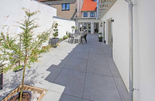 The historic building was extensively renovated in 2021 and furnished in a modern-minimalist style. The high-quality furnishings meet the highest standards. First occupancy July 2021 The ground floor has an open-plan layout. There are two living areas (upholstered furniture, seating areas, smart TV), a state-of-the-art kitchen (including electric hob with integrated Bora extractor fan, oven, internet-enabled fridge with ice cube dispenser, large dining table, various kitchen appliances), a small guest WC, 1 bedroom with double bed (connecting room to the bathroom) and a bathroom with open shower and washing machine. Upstairs there are two further bedrooms (each with double bed, flat-screen TV) and a bathroom with free-standing bathtub, open shower and LED mirror with integrated make-up mirror. A cot and high chair are available for small children. Additional guest beds can be provided for older children up to the age of 10.