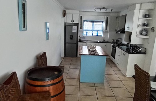 Escape to the tranquil beauty of Langebaan in this stunning self-catering holiday home, La Kruger Blue. Perfect for families and friends, this spacious property boasts 4 bedrooms, 3 bathrooms, and can accommodate up to 8 guests. The main bathroom features an en-suite, while the other two bathrooms are shared. The house is equipped with all the essentials, including a fully-fitted kitchen with electric oven, gas stove, microwave, and dishwasher. Enjoy quality time with loved ones in the dining room, lounge, and private outdoor spaces, including a balcony, patio, and outdoor furniture. Take a dip in the private outdoor pool or take a short walk to a white sandy beach. Linen and towels are provided, and the property is pet-free. With a washing machine and fan available, you'll feel right at home. This beautiful holiday home is the perfect retreat for those seeking a relaxing getaway in Langebaan.
