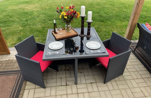 Our new outdoor patio with pergola, boasts a 4 person hot tub with ocean views, a wood-burning fire pit, comfortable Adirondack chairs as well as a cosy entertainment and lounging area to enjoy some appetizers and/or cocktails. Outdoor blankets for cooler nights are available.