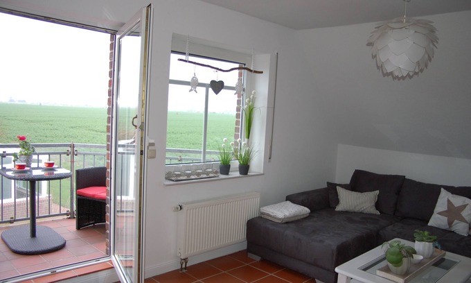 It was completely renovated in 2018 and is located on the first floor of a semi-detached house. In sight is the unique dry beach. Beach volleyball players and children can let off steam here. On the other side of the dike is the best bathing possibility of Krummhörn. Be enchanted by the special view of the countryside and the dike.