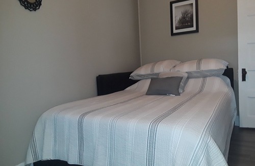 The bedroom features a full size corner bed with memory foam mattress. Additional twin cot can be rolled out for extra guest.