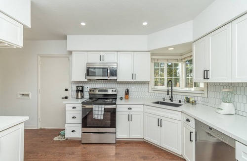Home includes two living areas, one is the official living room and the other one is the 'TV room', which holds a 55" TV. The living room leads into a separate dining room decorated with a beautiful large decorative clock. The home also includes two full bathrooms, one next to the guest bedroom and another one attached to the Master bedroom. The kitchen comes with stainless steel appliances, brand-new white quartz countertops, and recessed lighting. The guest bedroom has been furnished with a queen-size murphy bed, perfect for those wanting to use the space for an office or something else. The master bedroom comes with a cal-king size bed with a mounted TV and very large walk-in closet.