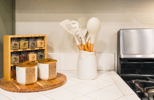 The fully stocked kitchen has everything for you, whether it’s a family dinner or entertaining guests. For fun, the garage game room features a racing rig, arcade, and foosball. Outside, the backyard fire pit with 4 Adirondack chairs and ambient lighting creates a relaxing evening atmosphere, while the covered with dining arrangement & next to the grill is ideal for gathering with friends and family.