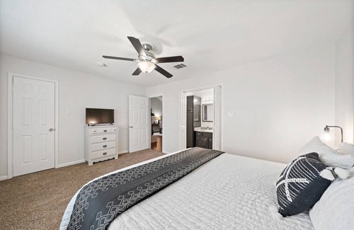 The house features 4 bedrooms and a game room. The entrance greets you with a cozy reading nook equipped with 2 chairs and a workspace. An open layout connects the living room, kitchen, and dining area. The master bedroom boasts a king-size bed with a private bathroom, while other rooms offer a mix of king, queen, and full-size beds. A shared hall bath is also available.