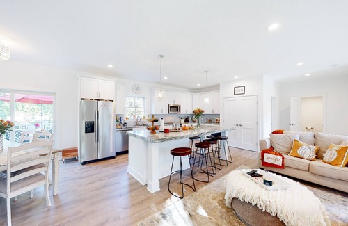 Thoughtful updates have expanded the home's footprint to 2,900 square feet. The elegant kitchen anchors the main level, offering stainless steel appliances (including a wine fridge and a dishwasher), a large island with bar seating, and a country dining table. For movie or game nights, gather in the living room or the cozy den, both with TVs.