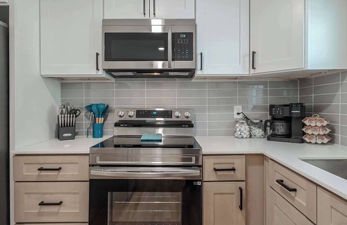 This entire 2-story home just underwent a complete remodel! New kitchen, bathrooms and laundry room await for you to enjoy. Large open living area flows into a kitchen that is fully-stocked with everything you will need to cook a home-cooked meal. If cooking on vacation isn't your thing, there are many wonderful restaurants in close proximity. Enjoy watching your favorite streaming shows or the big game on the 65" Smart TV in the living room. One bedroom with a queen-sized bed is on the lower level. Primary upper level bedroom has a king-sized bed and 55" Smart TV. It also features an ensuite bathroom with double sinks and beautifully tiled walk-in shower. Second upstairs bedroom boasts a 55" Smart TV, work desk and a private deck to enjoy a cup of coffee with the sunrise or a martini in the warm evening. There is a second full bathroom in the upstairs hallway with a new bathtub/shower. The main level laundry room has brand-new large capacity washer & dryer, large countertop for folding and ironing board/iron. Exterior home features include a large circle driveway for easy parking, dining room table seating for 6 and comfortable rocking chairs. Backyard features include adirondack chairs, fire pit and grill. Our home has lightning fast 2-Gig Fiber WiFi. **Fireplace shown is not operable.