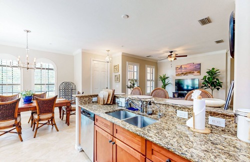 As you step inside, you'll be greeted by a cozy living space adorned with tasteful Florida-inspired decor. The breakfast bar is a great spot to savor your morning coffee while planning your day's adventures.