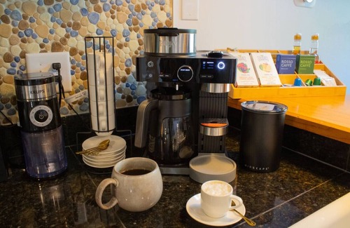 ☞ Coffee pot (drip + pod) + Espresso machine w/ fully stocked coffee bar