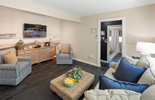 Flor de Chateau Jolie is a beautiful professionally designed Hamptons-retro style 3-bedroom 1.5-bath vacation home. It embodies that classically elegant summer beach vibe that quietly whispers 'vacation mode'.