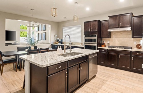 The resort-style backyard features a sparkling pool and relaxing hot tub, perfect for unwinding after a day of adventure. Inside, enjoy a chef’s kitchen with a 36" gas cooktop, high-end furnishings, and a smart, open layout that’s great for gathering and making memories. Thoughtfully designed with comfort in mind, including memory foam beds with crisp white linens. Conveniently located near local favorites like Queen Creek Olive Mill, Schnepf Farms, and more—Casa Solana is your perfect Arizona escape.