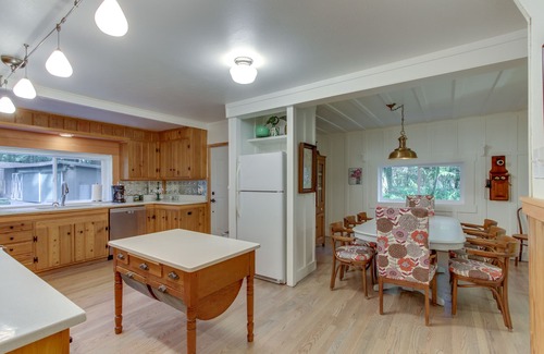 Enjoy the very best of old and new at this McKenzie Bridge home, a beautifully restored log cabin with a classic front porch, a sparkling interior, and a wonderful woodland location for exploring the nearby river, hot springs, and hiking trails. Originally built in 1909 and lovingly restored in 2016, the cabin's interior makes thoughtful use of natural wood, exposed brick, and pristine white walls. Prepare meals for a crowd with ease in the full kitchen, where you'll find stainless steel appliances (including a dishwasher), abundant cabinetry and counter space, and a large eat-in dining room table. Pass the morning hours outside on the porch, where you can read the newspaper in a rocking chair or use the free WiFi to plan your next hike. Grab your rods and tackle to spend the day fishing for rainbow trout or Chinook salmon; you'll come home to a private washer/dryer for your clothes, a pellet stove to warm your toes, and a flatscreen TV for movie nights in the plush living room.