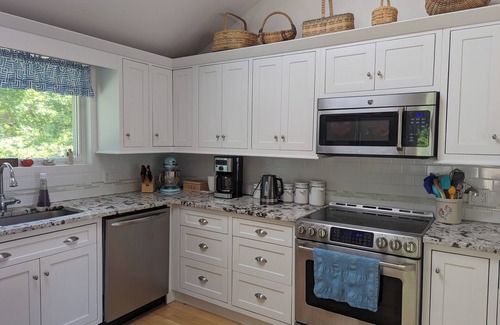 Kitchen has an electric stove (conventional or convection), refrigerator with freezer, drip coffee maker, tea kettle, toaster, mixer, griddle, all dishes and cutlery.
