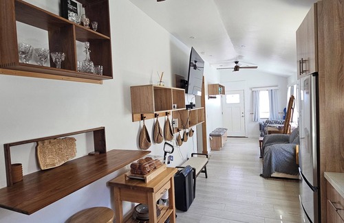 Fully-furnished residence offers Three Bedrooms & Two Full Baths with customized upgrades. The home highlights a full custom modern update with high vaulted ceilings, custom cabinetry and wood accenting thougtfully integrated to accomodate flow of space and use of space while also showcasing an architecurally unique modern design. The ergonomics and Feng Shui are designed for everyday life, work, comfort and relaxation because a home should resonate with a zenful vibration.