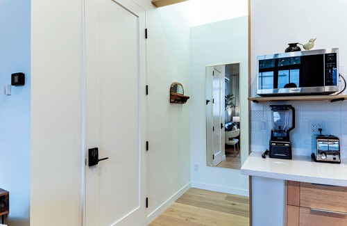 The suite is perfectly climate controlled with a natural gas fireplace and a combination heat cool Mini-split to keep the suite cool in the summer and warm in the winter. There's also a large ceiling fan in the bedroom.