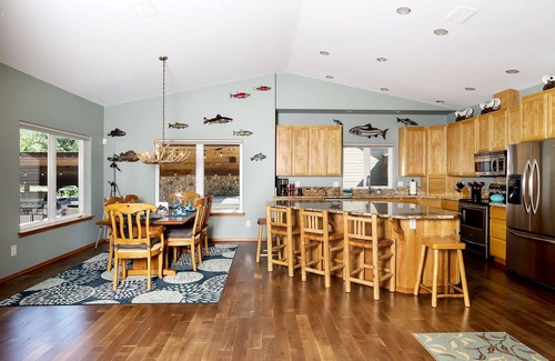 Discover a dramatic and wonderfully spacious open floor plan, stunning interior river views, 3 main level bedrooms and cozy sleeping loft. Naturally inspired finishes include slab granite, slate, river rock, hardwood flooring and rich cedar woodwork. The master has a king bed with ensuite bathroom that has a large stone shower. The other bedrooms have a king bed and a queen respectfully and another full bathroom. Upstairs in the open loft you will find two additional twin beds.