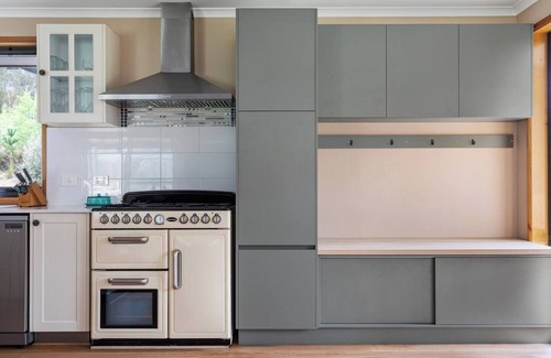 ‘River Rock Retreat’ features generous and thoughtfully appointed spaces that invite you to enjoy a holiday at home while taking in leafy bushland views. In the living room, settle in with a movie on two large sofas or choose from a selection of reading materials on offer, while a wood-burning fireplace keeps everyone cosy.