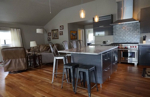 The Rio Grande runs right across the street from this two-bedroom home in South Fork, where you'll be able to spend your days fishing for abundant brown and rainbow trout. On this quiet, dead-end, dirt road, there are no buildings to block your view of the river, so you can wake up and go to sleep with the water in sight. Whether you're traveling to South Fork to ride ATVs, explore Rio Grande National Forest, or ski the fresh powder at Wolf Creek Ski Area (21 miles southwest), this house makes a wonderful home base. Enjoy a beautifully updated kitchen with stainless steel appliances and an island that provides space for both prepping and dining, comfortable living room furniture placed in front of a flatscreen TV, large windows that let in plenty of natural light, and free WiFi. At night, take your pick of two comfortable bedrooms, one with a queen-size bed and one with a double bed.