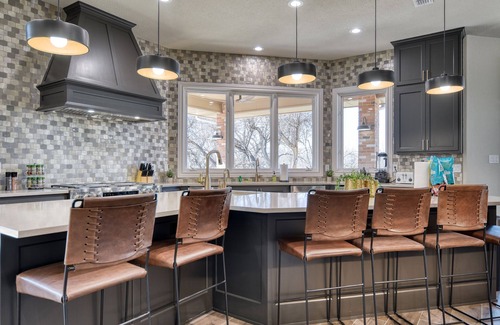 The vaulted great room has a beautiful stone faced gas fireplace and panoramic views of the property and the river. A 75" UHD TV sits above the mantle. Two large leather sectionals along with multiple accent chairs allow seating for everyone in your group. Enjoy a game of poker or Texas Hold’em at the large round game table or play a game of chess or checkers in the deconstructed leather game chairs