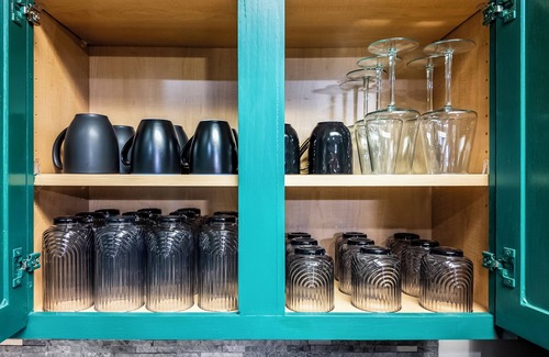The kitchen blends modern times with the twenties; with brass fixtures tying it all together for the best vintage aesthetic. It features granite countertops, stainless steel appliances, glassware and luxurious dishes. You’ll have everything you need that is needed in the kitchen, including kids’ utensils and dishes.
