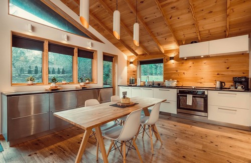 The fully equipped kitchen is a chef's delight, complete with modern appliances, ample counter space, and all necessary cookware and utensils. Whether preparing a simple breakfast or a gourmet dinner, guests will find everything they need to create delicious meals. The adjacent dining area features a large wooden table, perfect for enjoying meals together while taking in the picturesque surroundings through expansive windows.