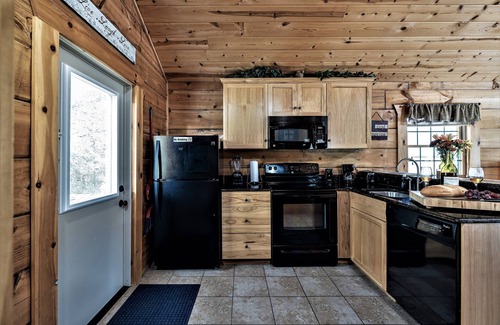 Step outside to the covered porch and relax in one of the two rocking chairs while enjoying your morning coffee and the tranquil views. The cabin is equipped with a private hot tub, a fully-equipped kitchen, satellite TV, and WiFi internet. The outdoor charcoal grill and fire pit with swing provide the perfect setting for a romantic evening under the stars.