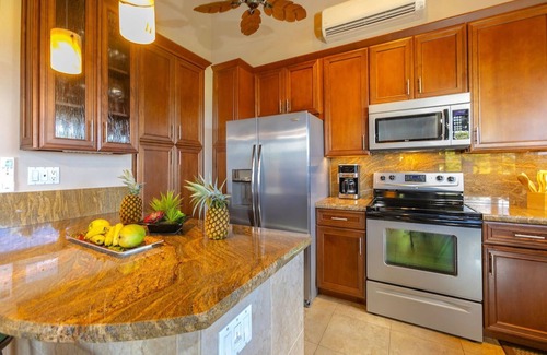 The kitchen has beautiful walnut cabinets, elegant granite slab counter tops, and quality, high-end stainless steel appliances. The gourmet kitchen is fully stocked with high end utensils and cookware. So should you decide on eating in you will have everything your heart desires to prepare a scrumptious meal. Before dinner out at one of the many extraordinary nearby restaurants, you can enjoy relaxing on the comfortable lanai dining set as you are amazed at the gorgeous views and beautiful sunsets. The sunsets from our lanai will take your breath away!