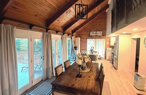 Nestled along Trappers Trail rd. The Miskwabi Hideaway blends upscale comfort with rugged Canadian wilderness. Surrounded by a private half-acre of towering maple trees, this bright and spacious chalet features cathedral ceilings, gourmet kitchen, large kitchen island, oversize dining table, a wood-burning stove, and deeded access to beautiful Lake Miskwabi just a short walk away. Deer are frequent visitors here, often spotted grazing at forest edge. Enjoy coffee on your private deck, and spend evenings around the fire pit or wood stove, check out nearby trails, markets, and even a Wolf Sanctuary, it's a perfect blend of romance, comfort, and adventure.