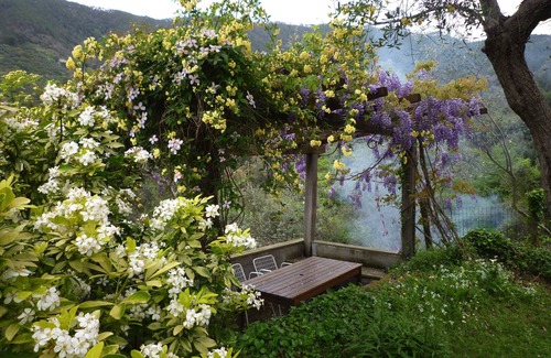 House Flora is a romantic, restored Ligurian stone house on the hills of Levanto in the Cinque Terre nature reserve. It is at the edge of the small village of Fontona, 3 km from the ocean, right on the hiking trail Levanto-Monterosso in a very quiet area with a beautiful panorama. The house has a large terraced garden with olive trees, blooming flowers and a lawn. The house (80 m²) has 3 bedrooms (2 single beds, bunk bed, French bed 140 cm), living room (satellite TV, radio, CD) with fireplace and wood stove, eat-in kitchen (dining table for 5-6 people, microwave, coffee maker), bathroom (shower, washing machine), an outdoor kitchen and loggia as well. There parking on the street above the house. ***foryou2009