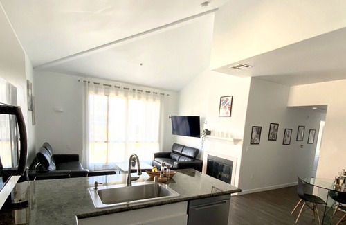Spacious top floor condo with vaulted ceilings, desirable Little Italy neighborhood. 2 bed 2 full bath, w&d, open concept living, huge private rooftop patio, and 2 garaged parking spots. Equipped kitchen, high end mattresses, remote work station, and 1gig internet. Experience Downtown/Little Italy lifestyle at its best. Walk to Little Italy restaurants, convention center, parks, farmer's market, and trolley. Up to 2 trained and well behaved dogs welcome with pet fee for extra cleaning required, no cats or other pet types. Dog park 1 block away! ~10 min drive to beaches, zoo, Balboa Park. 24hr gym!