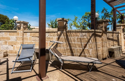 Angeli Nel Salento Country House in Santa Cesarea Terme offers you a shared terrace, a garden with barbecue, and a private park with palm and olive trees. Each unit has a private outdoor patio with table, folding chairs, and loungers for relaxing under the Salento sky.