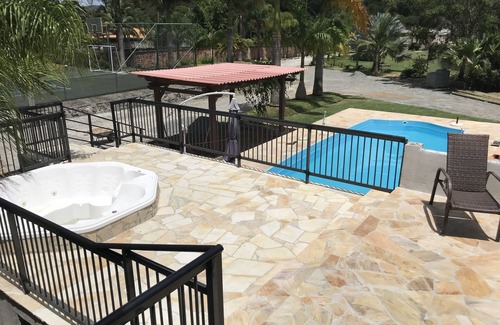 Beautiful farm in Camboriú / SC 10 minutes from the beach of Balneário Camboriú. We have a fishing lake, 2 swimming pools, 1 jacuzzi, 2 beach tennis courts, 1 sports court, table tennis, foosball, barbecue, laundry, full kitchen and parking. New accommodation with bathrooms (solar heating), 1 apartment (2 bedrooms with air conditioning, 1 bathroom and a kitchen / living room with TV) and 3 further suites complete with cable TV, air conditioning and WiFi. Semi artesian well water.
