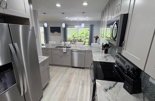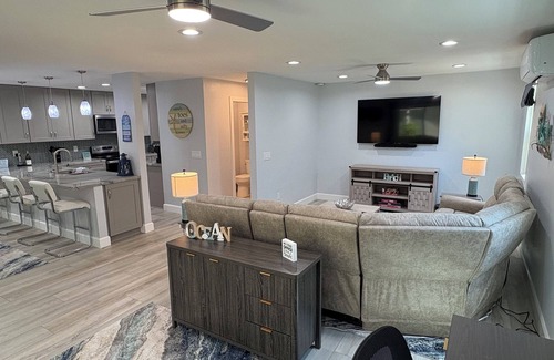 This 2-bedroom, 2.5 two story home was remodeled in 2025. The main level boasts a kitchen with countertop seating. A dining room connects to the large living room, and a patio surrounded by lush tropical greenery.