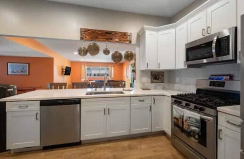 Inside you'll be welcomed by a homey and eclectic interior, with lots of fun colors and plenty of places to sit and relax. The couch was made for lounging about and watching movies on the TV. The living area, dining area, and kitchen are all open and adjacent to each other so that no conversations will be missed. The chef of your group will love cooking in the updated and gorgeous full kitchen, complete with stainless steel appliances and all the cupboard room you could ever want. It'll be hard to choose where to lay your head with three cozy bedrooms and soft beds, but you'll get a great night's rest to prepare for the next day's activities. We have 2 queen beds and 1 full bed. There's a dedicated office workspace for those who need to stay connected and a comfortable back patio with a firepit for s'mores and ghost stories.