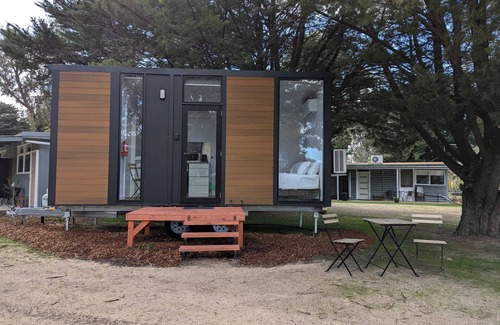 A cozy 139-square-foot tiny home with split air conditioning, linens and towels, a kitchenette (including a fridge and microwave), and cooking equipment. The bathroom uses a cassette toilet with a removable waste-holding tank, hand basin, and shower (gas-heated for hot showers) for you to use.