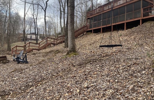 This nice Lakefront home on Rough River is ready for the whole family to enjoy. This cozy cottage sits on a wooded lot and hosts loads of room. The open concept kitchen, dining and family room is great for family/friend gatherings. It sleeps up to 12 people. Enjoy amenities such as TWO large decks facing the river, one screened in. Accompanied with a six person Hot Tub, Kayaks, an open Firepit, and steps leading to the water to swim, fish, or go boating.