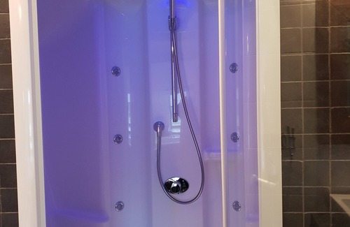 Wake up in the spacious 2 person bedstead(180/220 overlooking the countryside. A dream come true. If you come together with the children then it is draw lots who sleeps where. There are also 2 fine box spring beds 90/210 which are adjustable. The TV can be seen from your bed, but also if you sit on the lounge sofa you can watch fine TV. The internet is top notch. (Feel free to bring your own chrome cast). There is a small but complete kitchen with 2 burner stove, combination microwave, filter coffee maker, kettle and plenty of utensils. The sunny terrace faces south, enjoy the sun and the great view. The bathroom is a mini wellness experience Steam room for 2 persons with eucalyptus (here you can also shower) a whirlpool bath, even if the weather is less you can enjoy the luxury of your own Farm Room. The toilet is separate, which we find very pleasant.