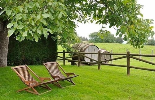 In Llagar de Naveda is a house for 4 people (2 double rooms), 2 bathrooms, living room with fireplace and TV, kitchen, porch with barbecue and garden. If something falls in love with the El Llagar house, they are the exterior ones. Located on a hill surrounded by a garden (for private use of guests), it dominates the council of Cabranes, the Sierra del Sueve and the Picos de Europa. The large covered porch where we find the barbecue, has been designed for enjoyment at any time of day and is perfect for an outdoor breakfast or a delicious snack with the embers.