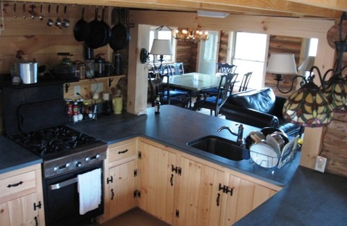 This custom built 4 bedroom log cabin is located in an extremely private setting on 150 acres of property with a large swimming pond and beautiful views of this gorgeous, unspoiled corner of Vermont. The property is off a dead end road and near hundreds of acres of conserved land so it is a true get away. If you can't travel without your hair dryer than this isn't the place for you, but if you love the great outdoors this rustic retreat is sure to please. One king bed, one queen(in the loft), a double/full (downstairs) and 2 bunks + a full in the bunk room provide ample sleeping for two families in 3 bedrooms and a loft. This home is off-grid so it is rustic, but well equipped with a gas fridge, gas stove and a solar powered electrical system with a back up generator. One bathroom with a double shower and huge tub provide a perfect solution to the sore muscles that are inevitable after a long day of mountain biking on the Kingdom Trails in East Burke, VT or summiting one of the area peaks.