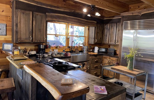 10ft custom indoor dining table along with outdoor dining. No 4x4 needed to get to the cabin. It is along a paved road and easy to get to. Always decorated for Christmas & other Holidays!