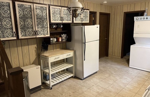 In the living room you will find a recliner sofa, a custom built wooden coffee table in front of the fireplace with a wood burning stove insert, and a custom built, bar height, dining table with four, fabulous green metal stools. Take in the gorgeous parkland and wildlife views and from the large bay window in front of the dining table as you sip your morning coffee. The cottage also has a covered front porch at the front of the house with panoramic views, and just outside, guests have access to a large stone patio with a fire pit, and an outdoor fireplace, and Adirondack chairs for relaxing around the fire. Private lake access through the empty lot across the quiet street, and kayaks, paddles and life jackets are available, weather permitting.