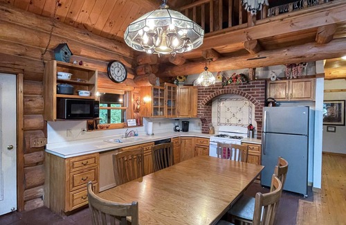 This 1850 square foot home offers rustic luxury in a majestic full log retreat. We have 3 large bedrooms plus a sleeping loft, 2 full baths, a great room with fireplace, a modern kitchen, separate laundry room, and country charm throughout. Our huge deck is level with the lake, and is perfect for cook-outs or watching the sunset. The large screened porch runs along the side of the building. This non-smoking home sleeps up to 9 guests.