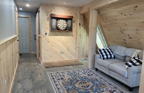 Lovely converted barn with larger eat in kitchen, spectacular water views. Large living room with professional dart board. Large bedroom with comfy bed. Access to private waterfront docks for boating; swimming, or ice skating to the winter. Two Kayaks and a Canoe on property..